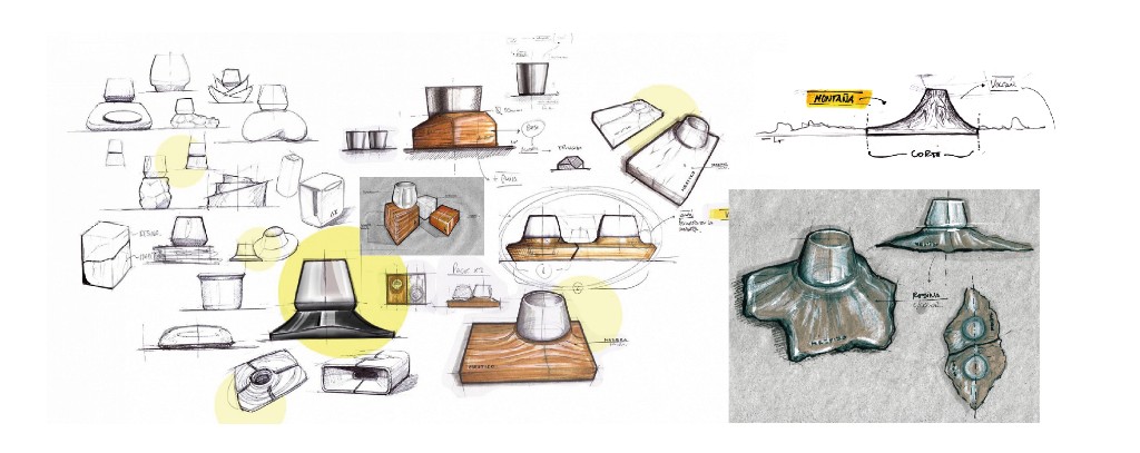La forma del plato no es decorativa. Emula la topografía de un volcán y está inspirada directamente en el Volcán Lanín, un ícono natural de nuestro territorio. Las irregularidades, los desniveles y la textura del aluminio fundido construyen ese paisaje. Y ahí es donde el objeto termina de cobrar sentido conceptual: como en un volcán real, desde abajo emerge algo hacia arriba. En este caso, los aromas del café.