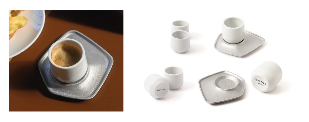 Cuando el pocillo caliente se apoya sobre el plato de aluminio, el calor se disipa, el conjunto se estabiliza y la forma acompaña el ascenso de los aromas. Morfológicamente, el objeto se asemeja a un volcán. Funcionalmente, también. El café “emerge”.